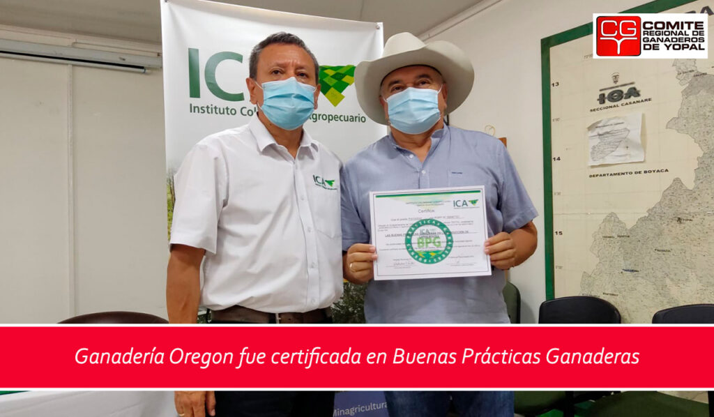 Este viernes 5 de noviembre, Orlando González de la empresa Agroindustrias y Servicios Ambientales S.A.S, recibió certificación en Buenas Prácticas Ganaderas del predio Las Payaras ubicado en Yopal, la cual le fue entregada por Edgar Lozano, gerente seccional Casanare del Instituto Colombiano Agropecuario ICA.